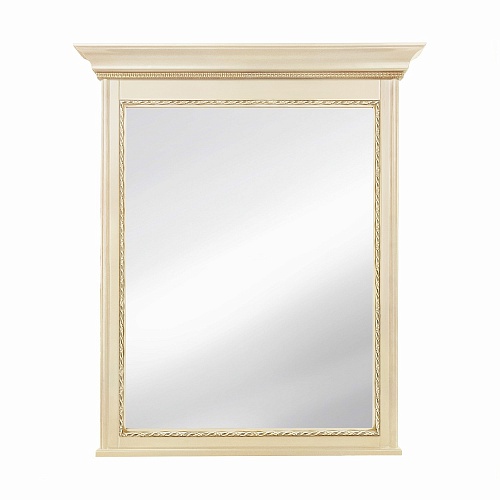 Рама зеркала выполнена из МДФ, облицованного шпоном дуба в светлом оттенке слоновая кость и декорирована контрастной золотой патиной, которая придает изделию законченный вид.