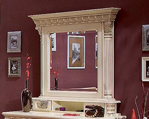 Рама зеркала выполнена из массива дерева и декорирована резными элементами и декоративными пилястрами, которые подчеркивает классический дизайн изделия.