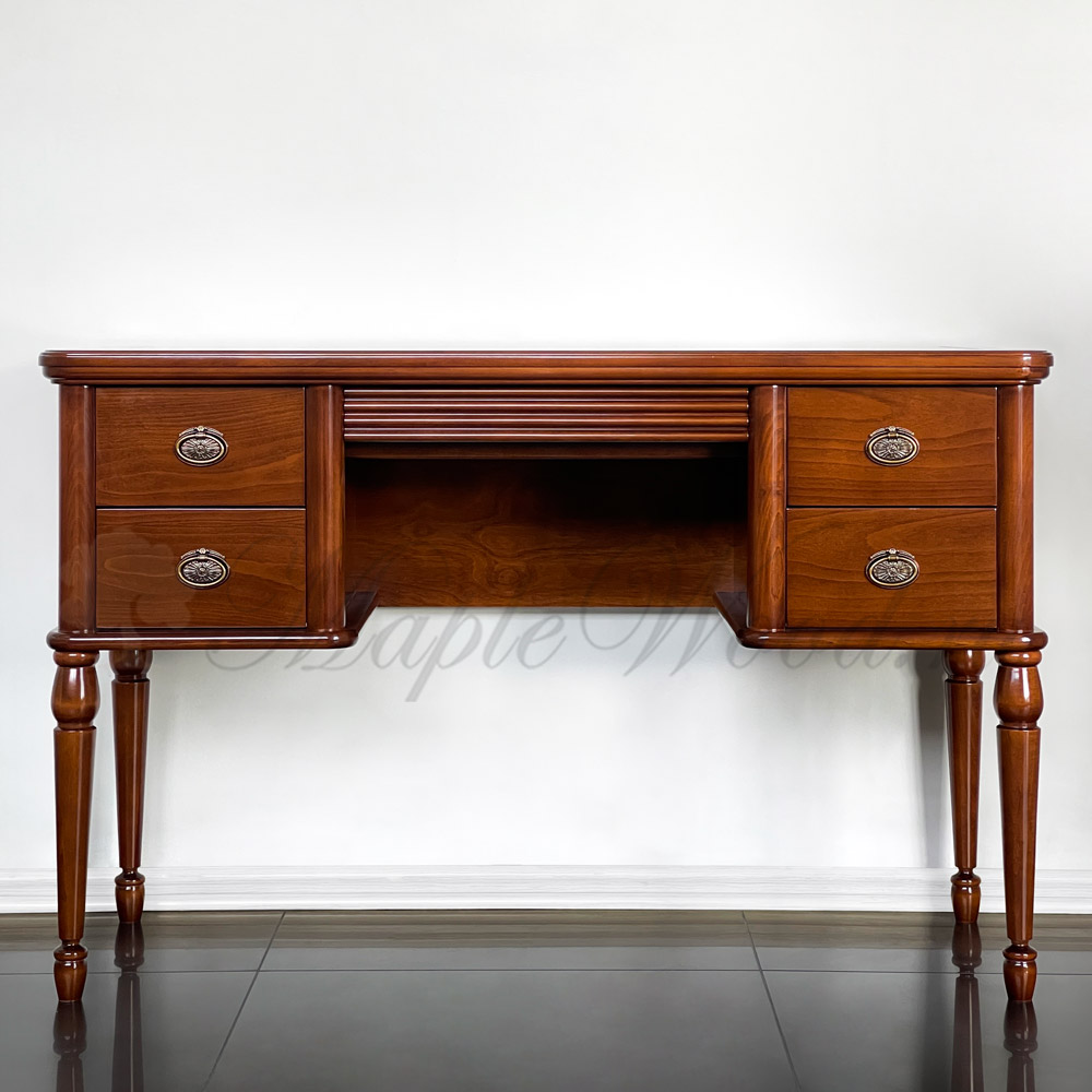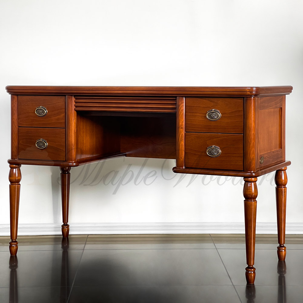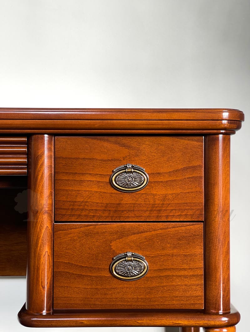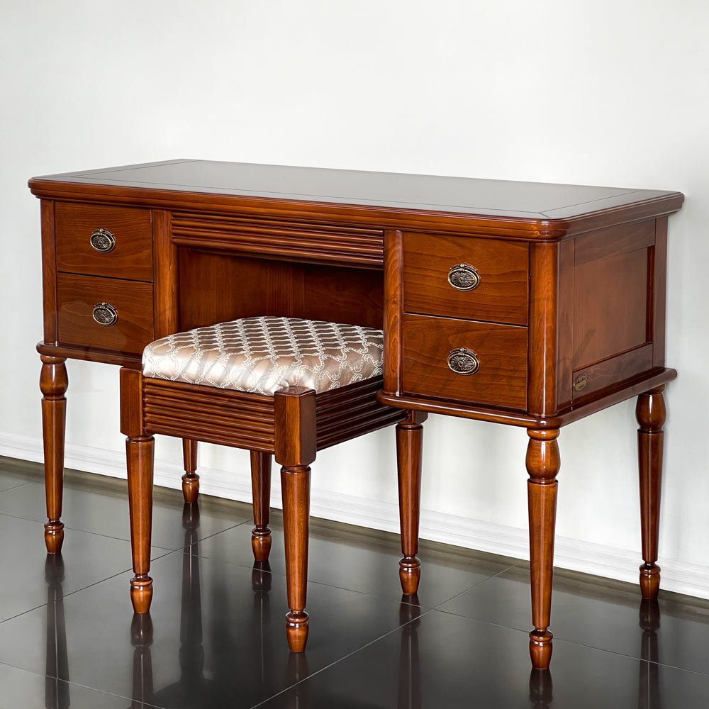 Классический туалетный стол на ножках из коллекции Мария Сильва от фабрики Monte Cristo Mobili выполнен в лаконичном дизайне из натурального массива дерева и оборудован пятью выдвижными ящиками для удобного хранения косметических принадлежностей и аксессуаров.