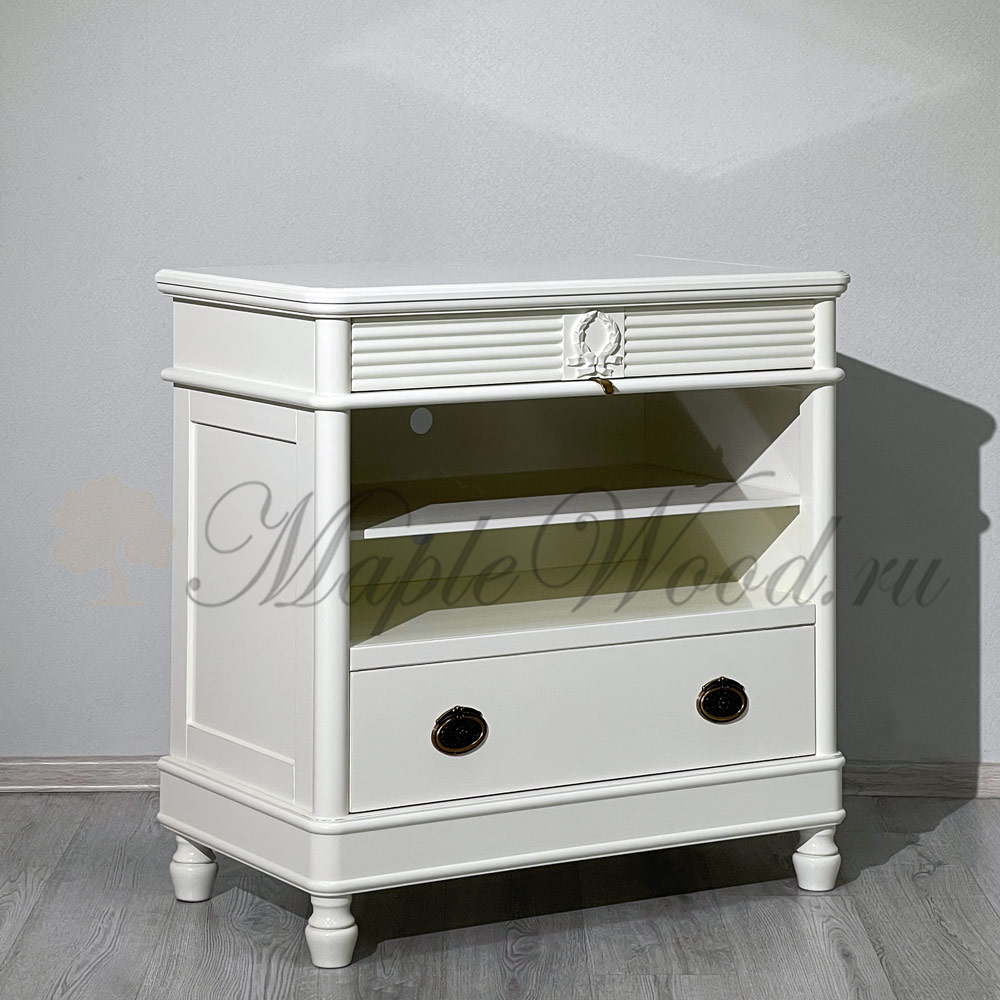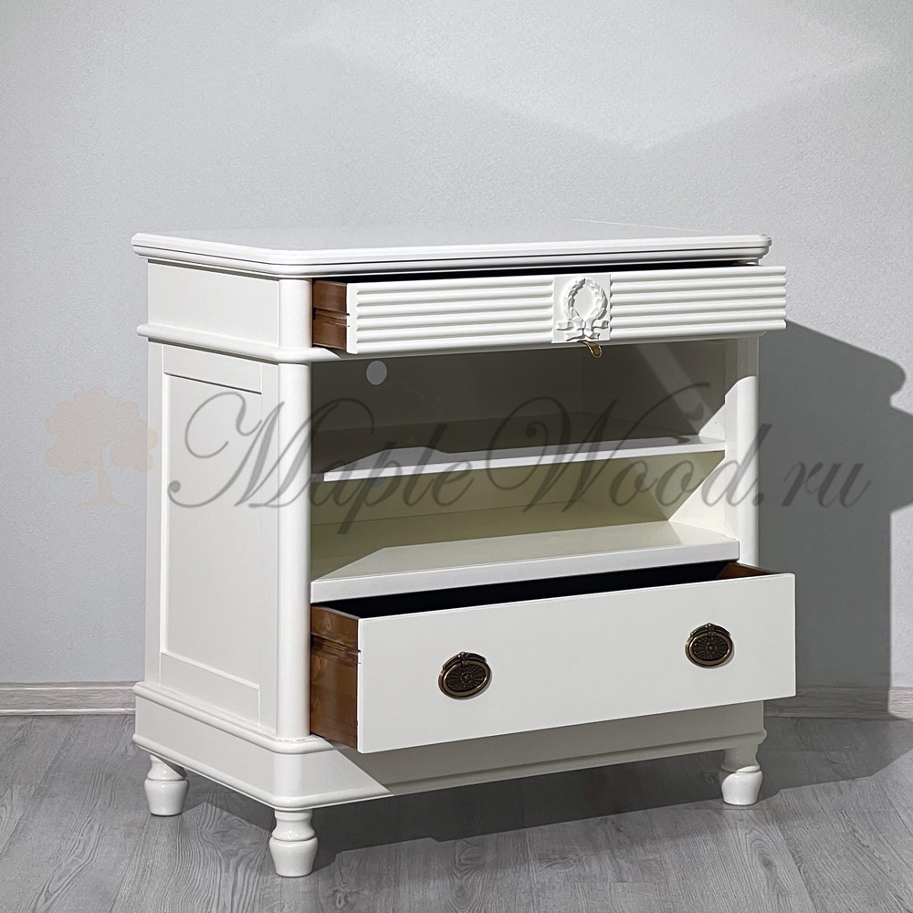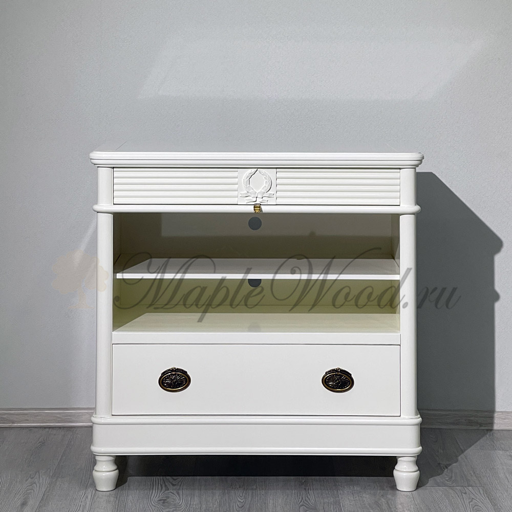 Комод под ТВ из коллекции Мария Сильва от фабрики Monte Cristo Mobili оборудован открытой нишей с полкой и двумя выдвижными ящиками.