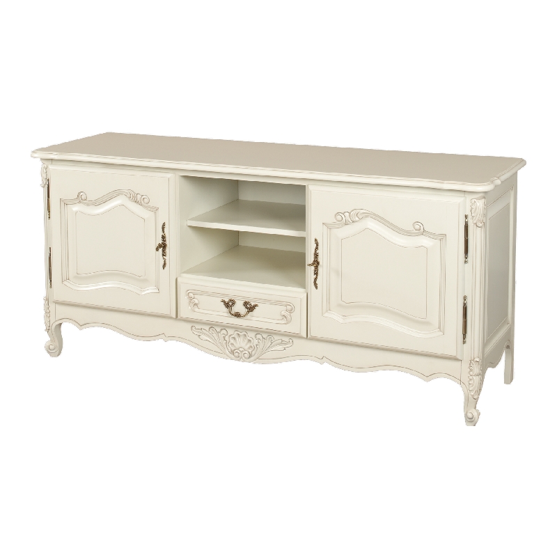 Тумба под ТВ из коллекции Могадор от фабрики Мобекс | Mobex выполнена из массива дерева в светлом оттенке слоновая кость и декорирована резными элементами, которые подчеркивают классический дизайн изделия.