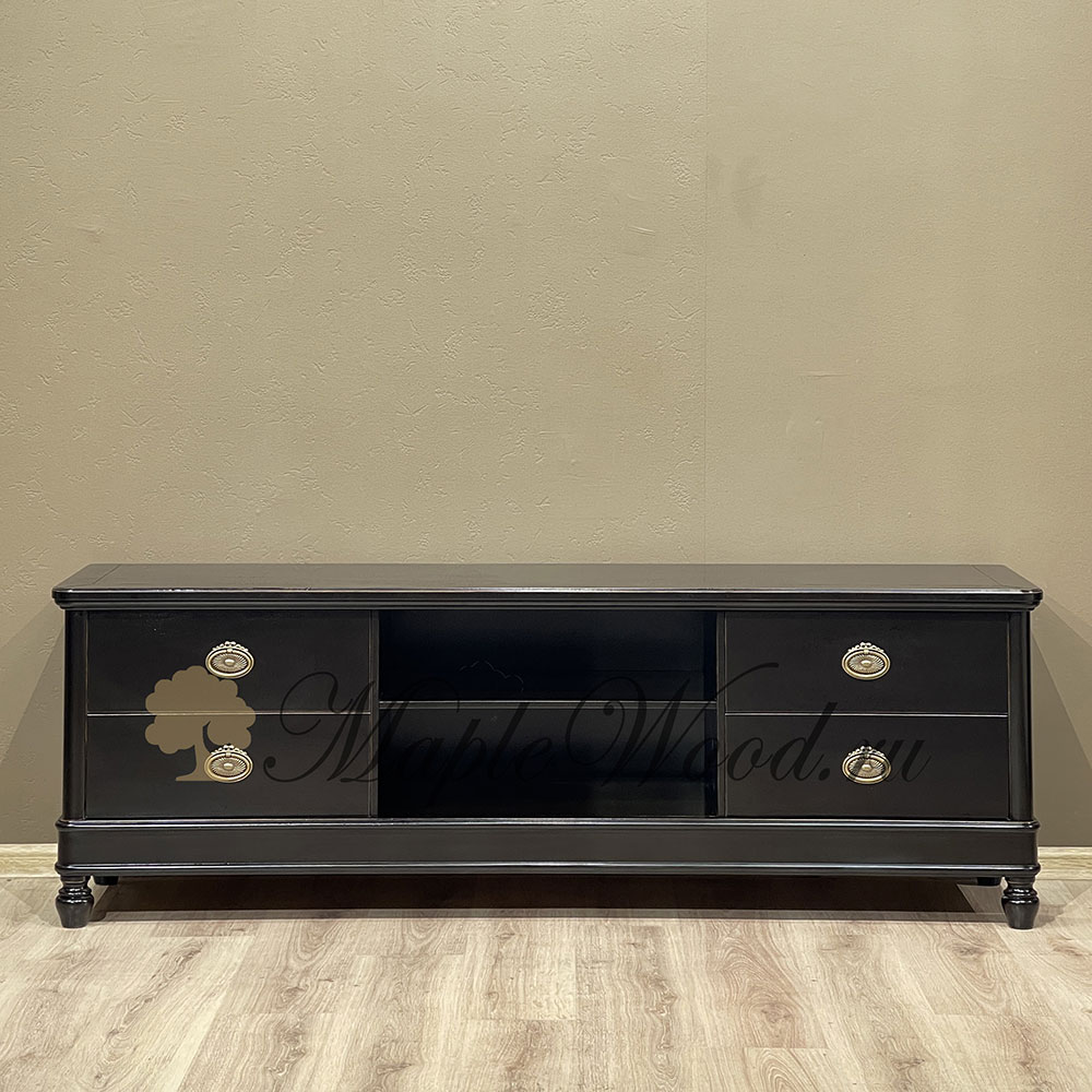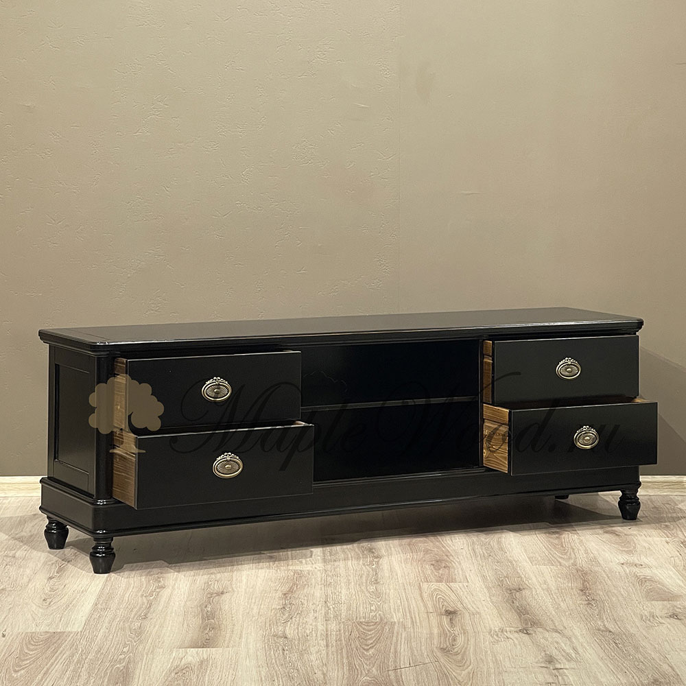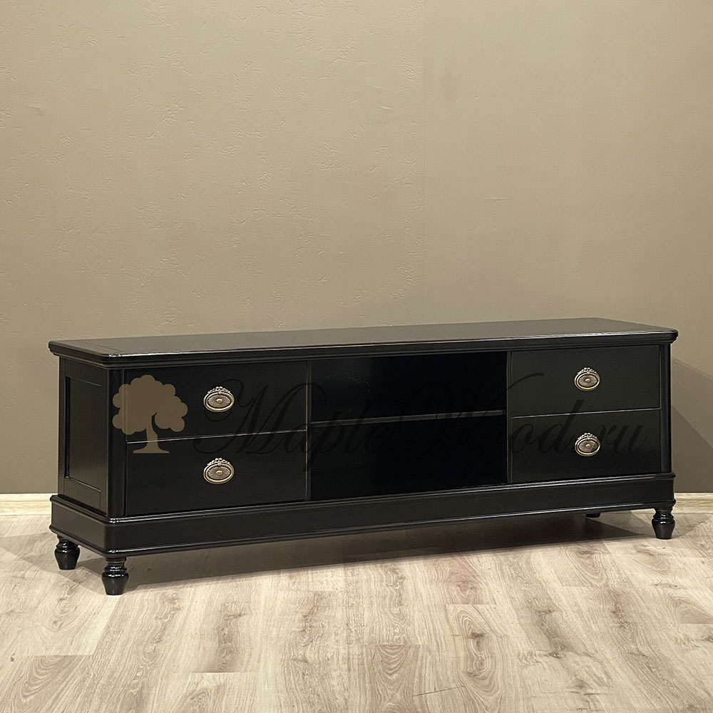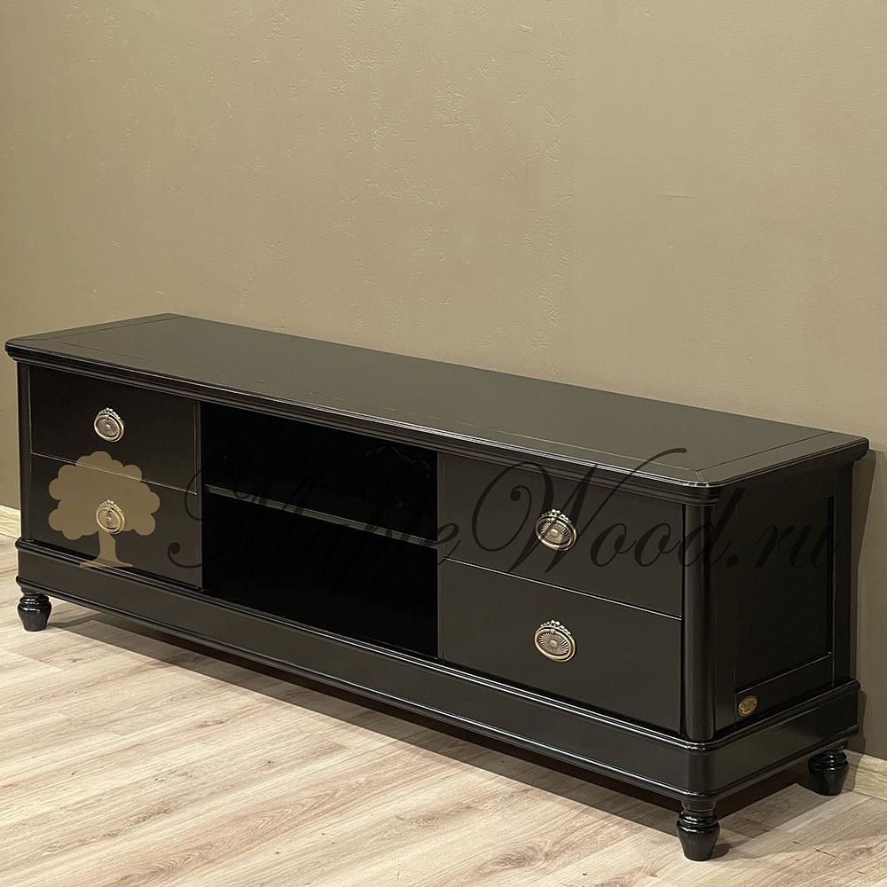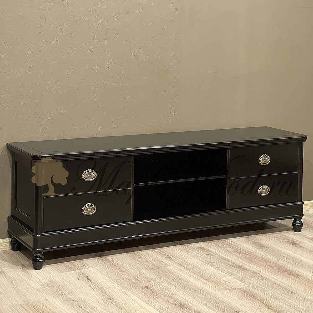 Тумба под ТВ из коллекции Мария Сильва от бренда Monte Cristo Mobili - классическая модель в нестандартном черном цвете, оборудованная открытой нишей и выдвижными ящиками, которые внутри отделаны контрастной отделкой с ярко выраженной текстурой дерева.