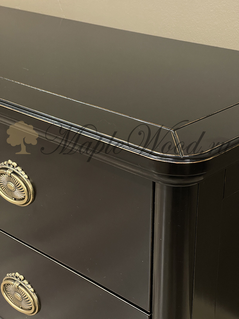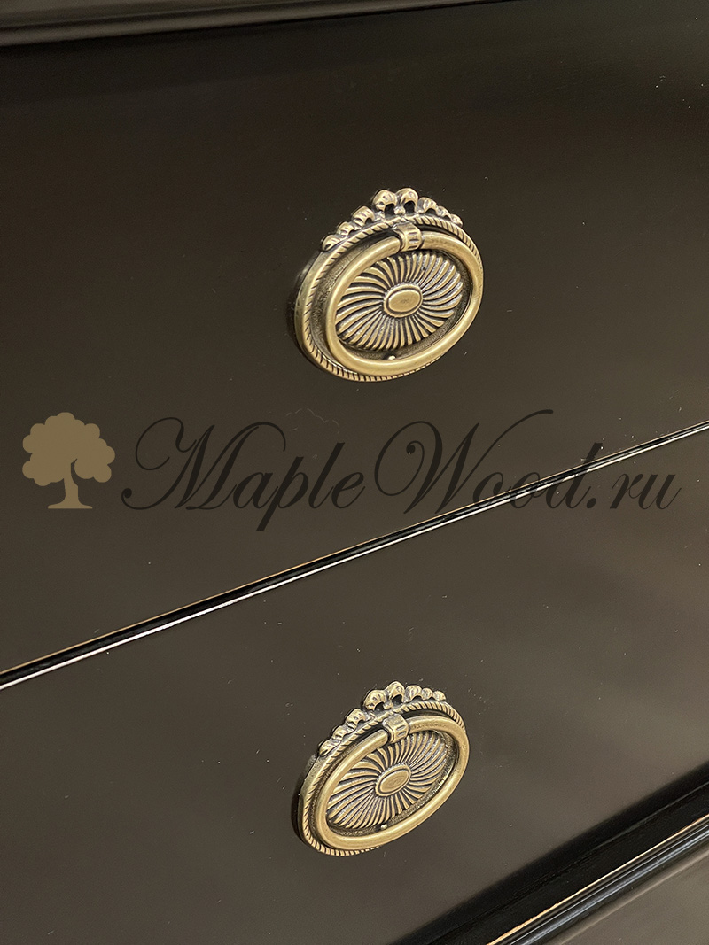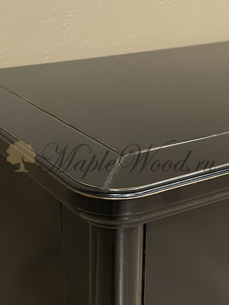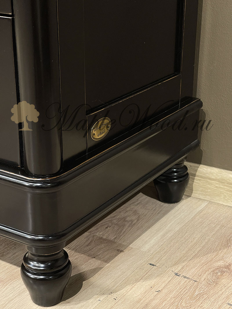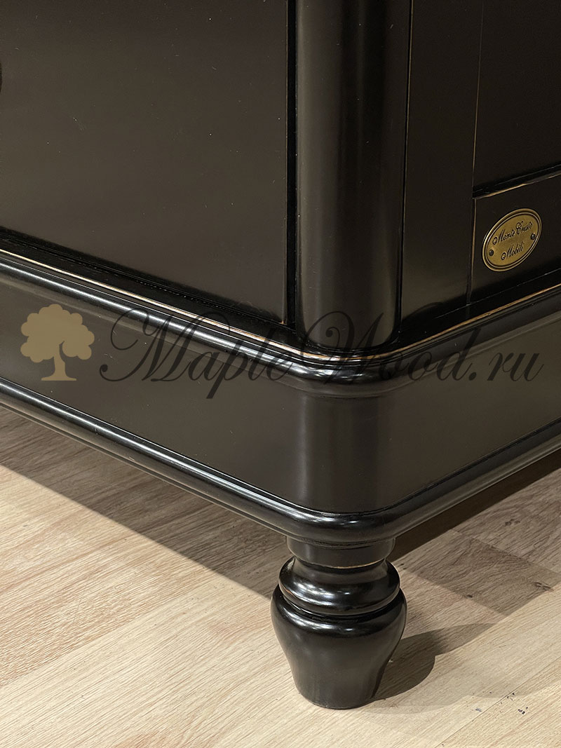 Тумба под ТВ из коллекции Мария Сильва от бренда Monte Cristo Mobili - классическая модель в нестандартном черном цвете, оборудованная открытой нишей и выдвижными ящиками, которые внутри отделаны контрастной отделкой с ярко выраженной текстурой дерева.