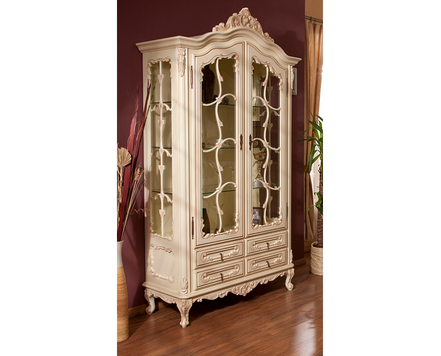 Витрина выполнена из натурального дерева в светлом оттенке и украшена резьбой ручной работы, которая подчеркивает роскошный вид изделия.